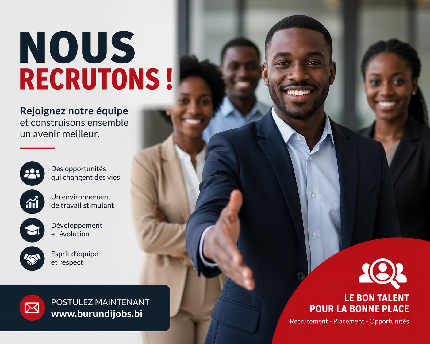 Concrètement, Burundi Jobs prend en charge tout le processus : de la publication de l’offre, au tri des candidatures, jusqu’à la sélection des meilleurs candidats. Résultat : vous gagnez du temps, réduisez vos coûts et recrutez avec plus de précision. Avec une large base de professionnels et une forte visibilité nationale, elle permet aux entreprises d’accéder rapidement aux bons profils.