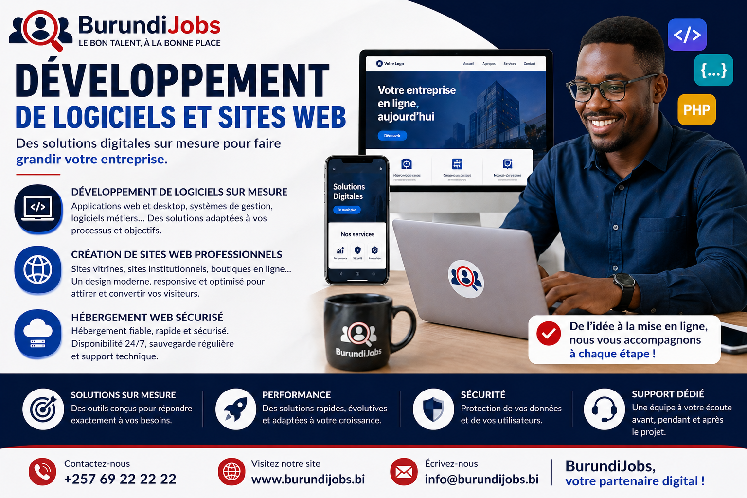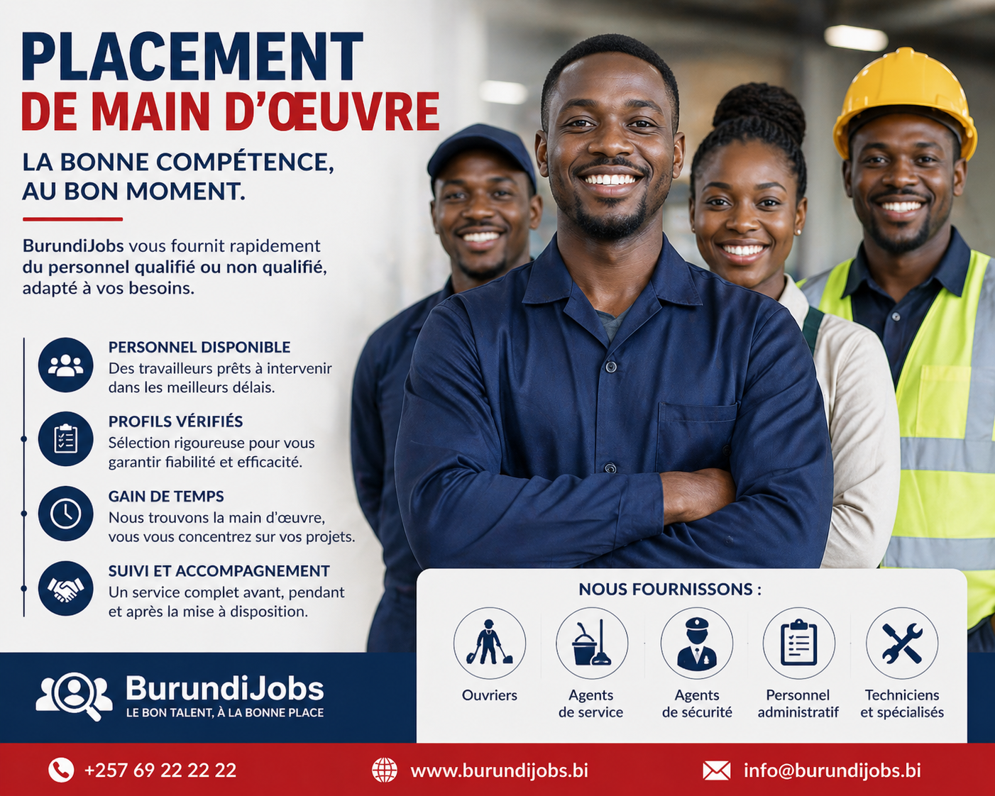 BurundiJobs (www.burundijobs.bi) est une entreprise spécialisée dans la publication d’offres d’emploi, le recrutement et le placement de main-d’œuvre au Burundi. Créée en 2017, elle s’impose aujourd’hui comme l’un des principaux outils digitaux de mise en relation entre employeurs et candidats au Burundi.